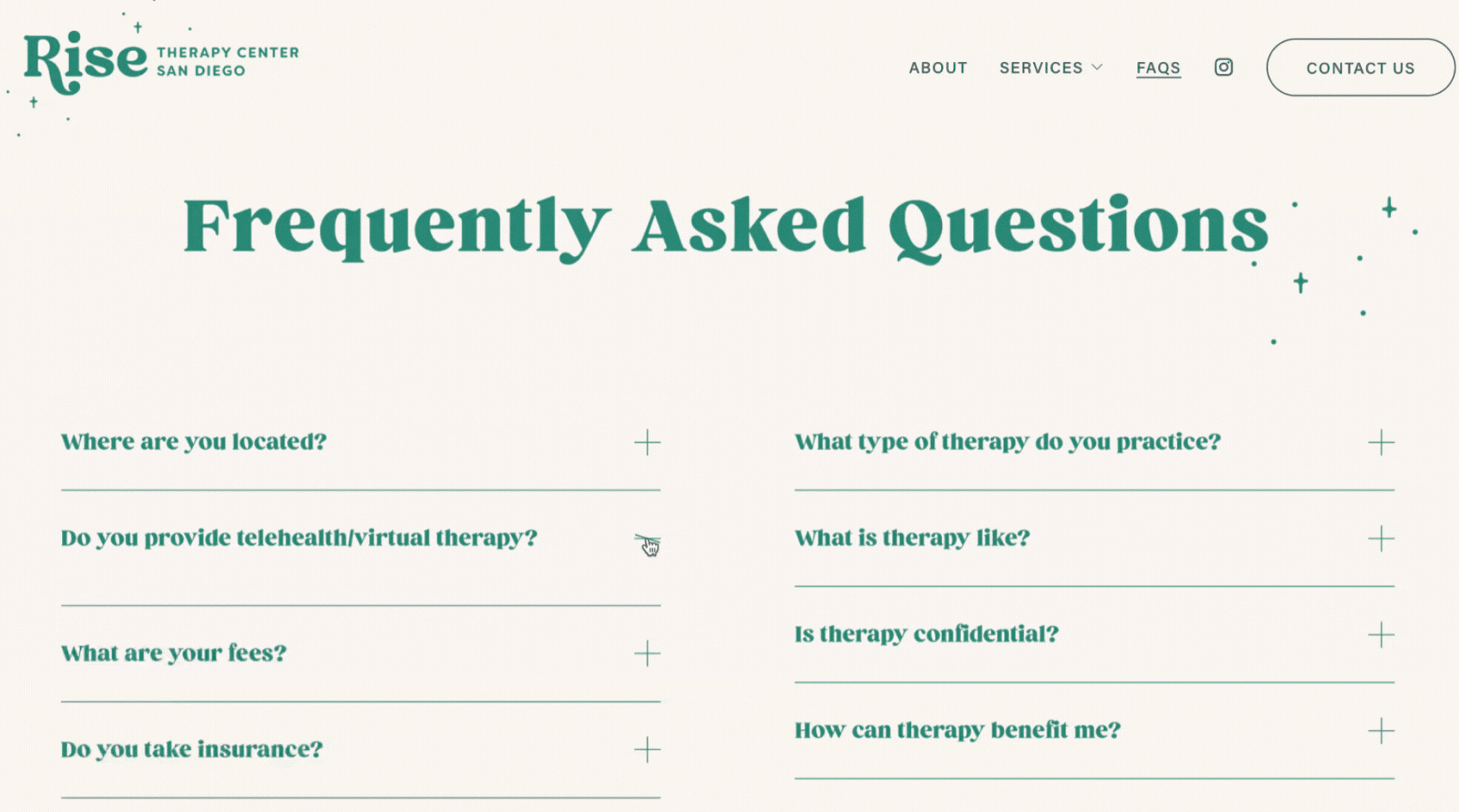 Accordion blocks are perfect for organizing longer content in a way that feels clean and inviting. I use them often for FAQs, specialty pages, or even bios on group practice websites. Instead of overwhelming visitors with a wall of text, accordion menus let users click to expand the info they care about, keeping your site looking tidy and helping people engage on their terms.