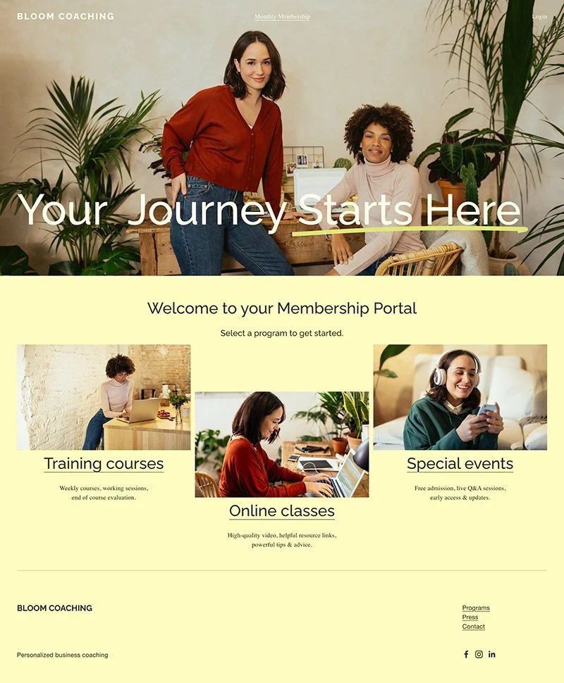 Here’s an example from Squarespace of a way you can set up your member area (this template is called Bloom).